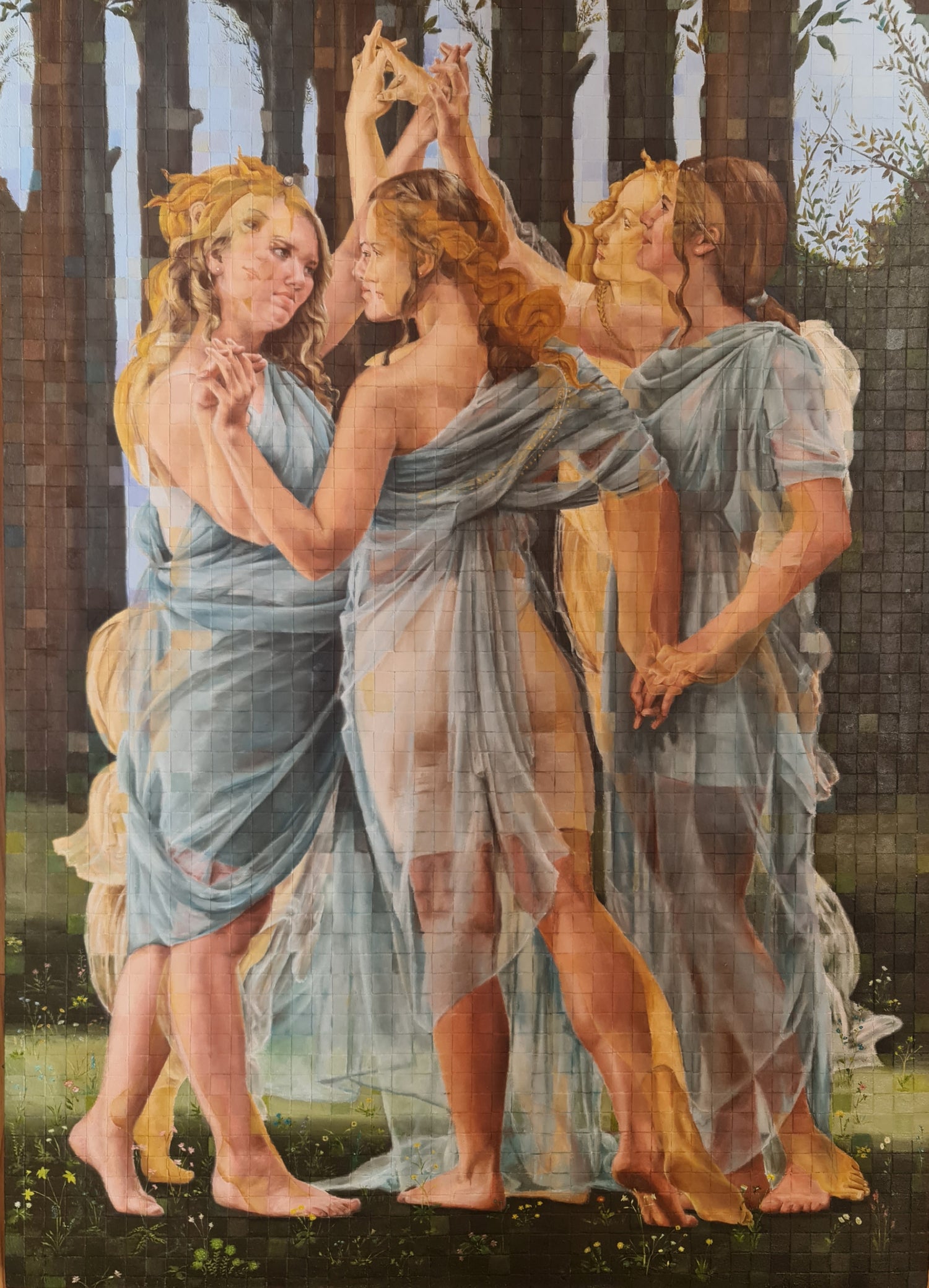 Yesterday, Today, Tomorrow is created with oils on mosaic tiles.