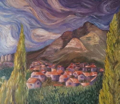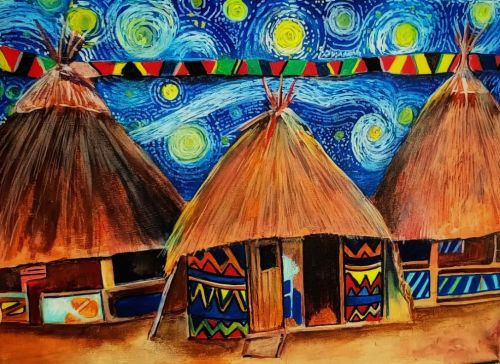 This colourful piece with title, Starry Night Over South African Huts: Shining Amidst Adversity, is created with Acrylic and acrylic pens on canvas.