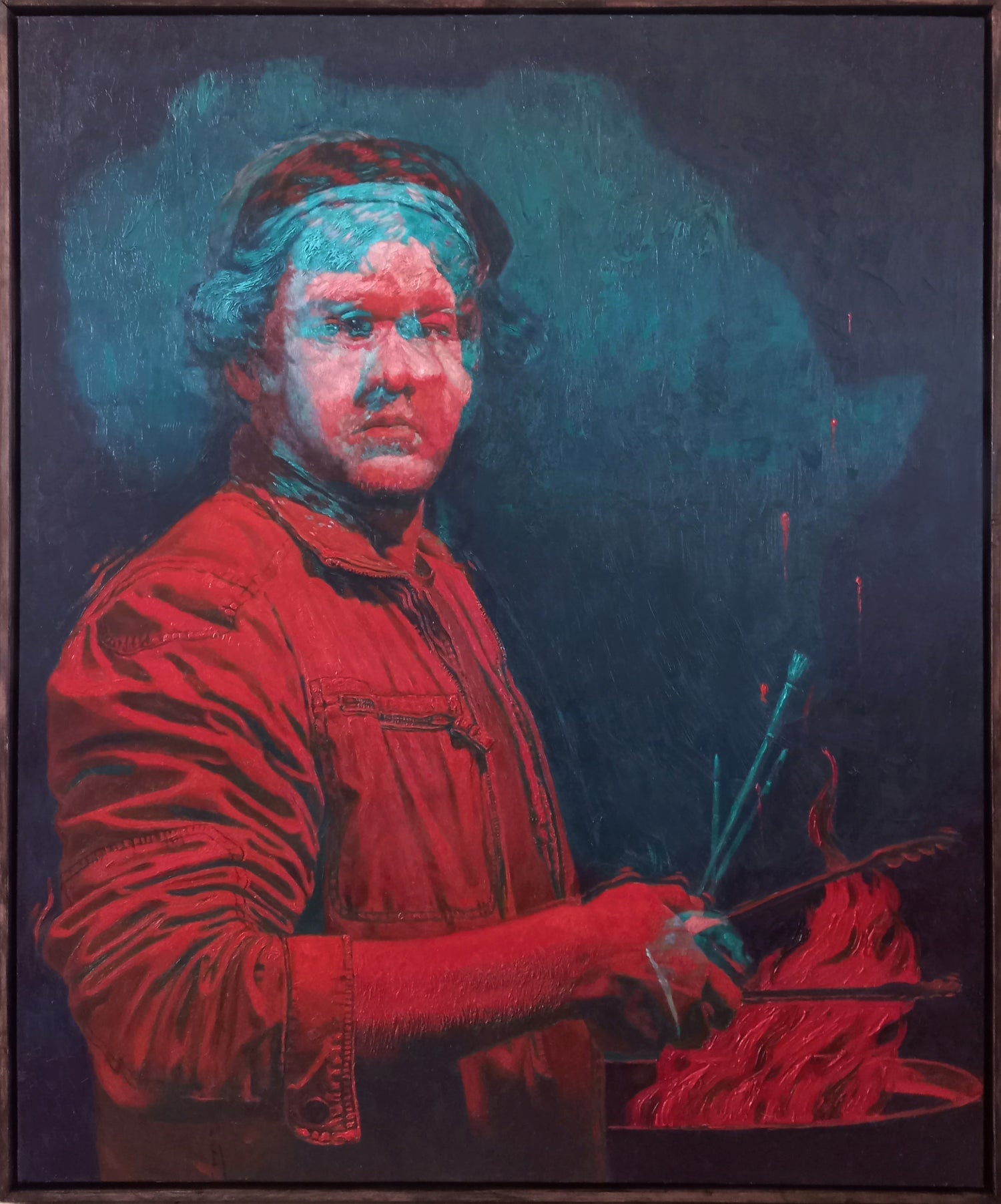 This extraordinary winning piece with title, Brandewyn Brille (Brandy Goggles) is created with oils on canvas. This is more than just an oil painting, but a magical conversation started, executed with exceptional skill.