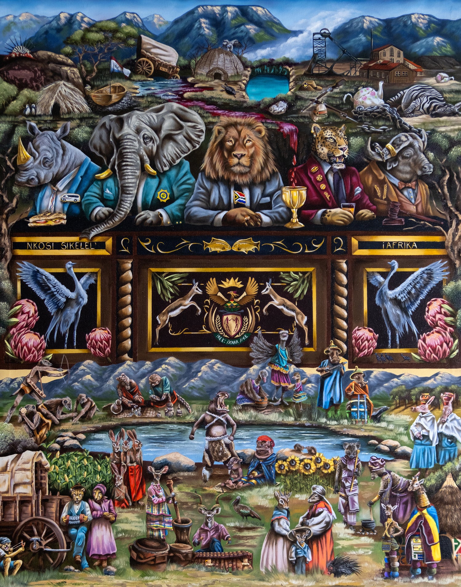 This intricate piece with title, Nkosi Sikelel' iAfrika, is created with oils on canvas.
