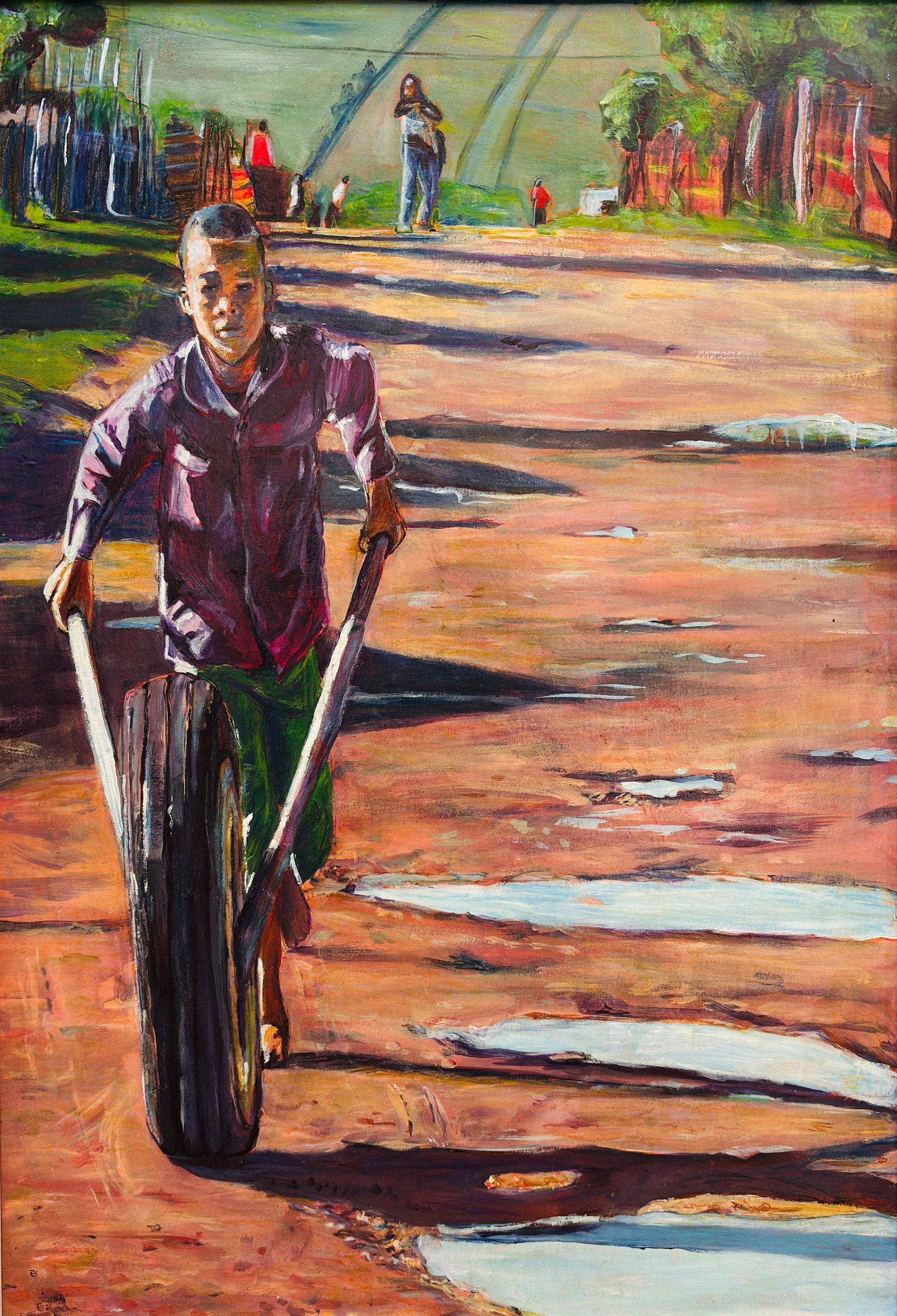 Inspiration: The artist was inspired by a moment taken in Umzamowethu, where the children were playing with a carefree innocence. This, enclosed with community, portrays the everyday life of children in townships. Children can be found playing in the streets rather than in front of a tv screen. Although these moments seem idyllic, the title of the work also refers to so many of these young people who keep on running in circles. It reflects how fatherlessness, educational restrictions, crime and poverty mindset are running these children tired (tyred). Many of them find themselves “running” alone. This painting is a prayer for the children, who need to grow up too quickly, to keep their innocence and creativity and to run the “race” to the end. We see you and we love you.